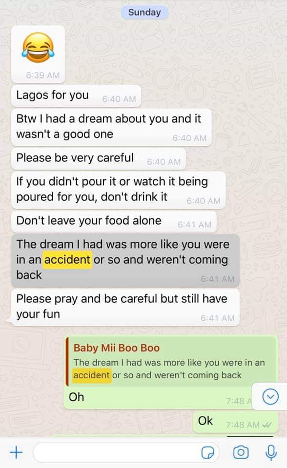 Mabel also shared a screenshot of the chat she had with a friend who told her to be careful few days before the accident. Read below.