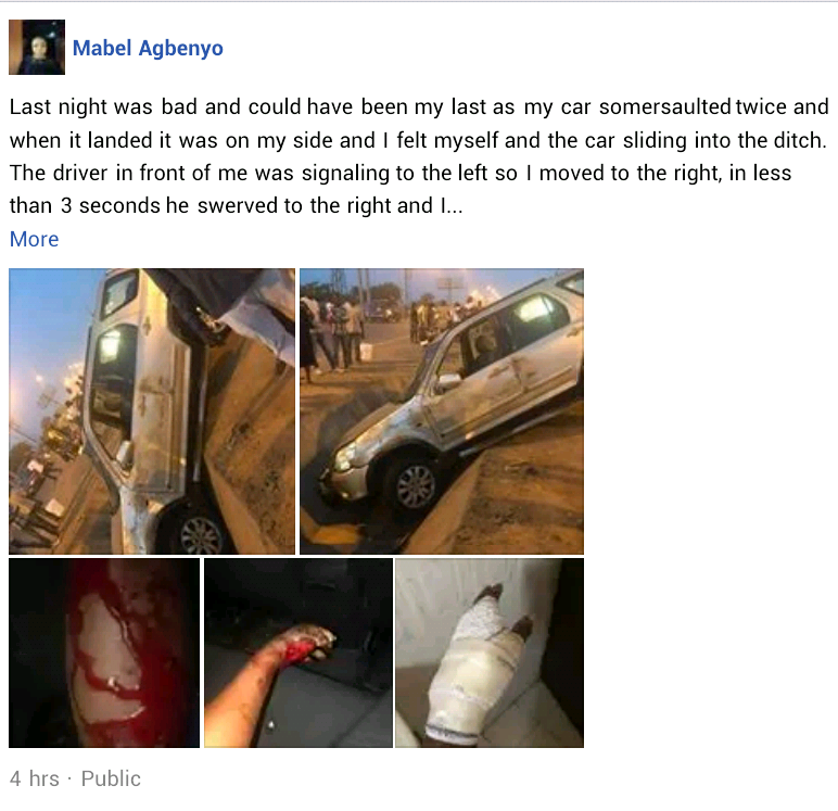 A Nigerian Mabel Agbenyo who is thankful to God for being alive, has taken to Facebook to narrate how she survived an accident in which her car somersaulted twice and fell into a roadside ditch. Read her post below: