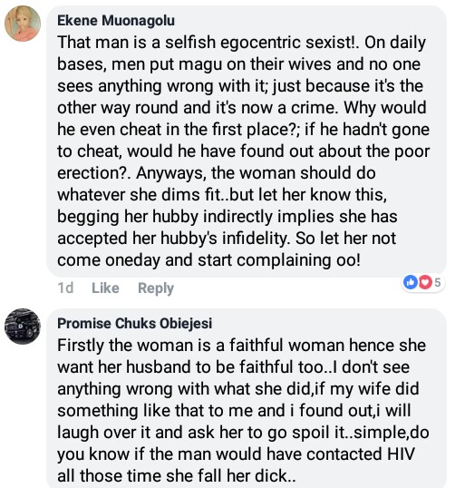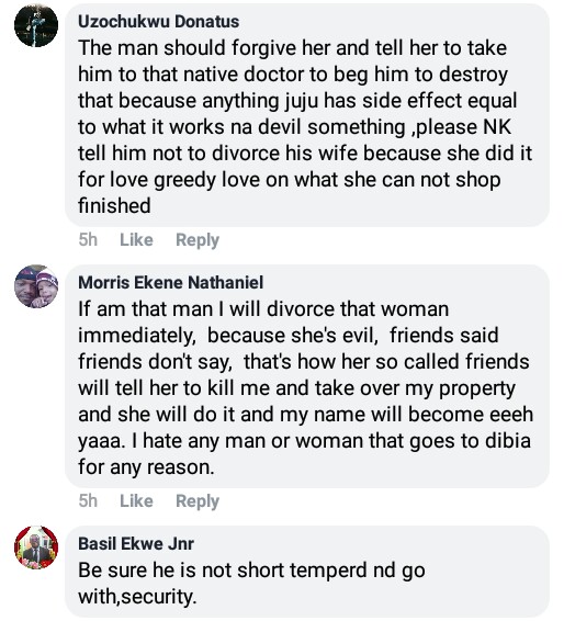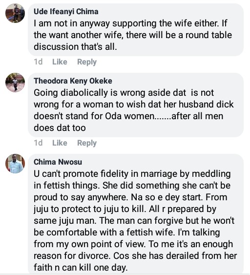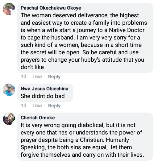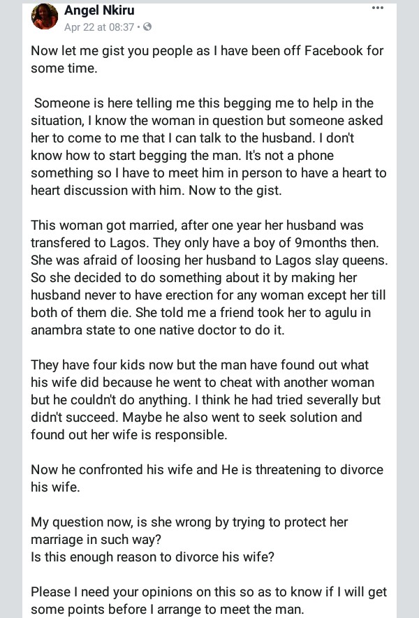 A lady shared a story on Facebook of how a woman who was afraid of losing her husband to 'slay queens' after he was transfered to Lagos, visited a native doctor who did a charm to make the husband lose erection when with other women.