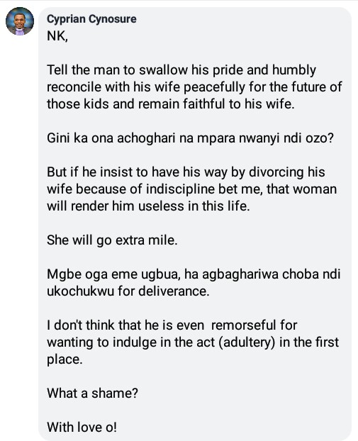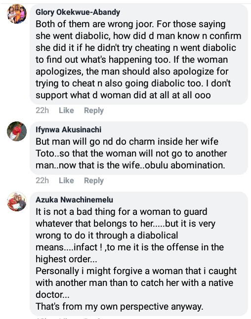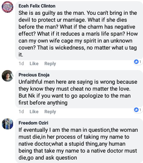 According to the story, the said husband years later, found out about the charm after several attempts to cheat and has since been threatening to divorce his wife.