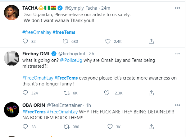 Nigerian celebrities including Burna Boy, Runtown, Peter Okoye, DJ Spinall, Tacha, Teni, Do2tun, Fireboy DML, Mr. Macaroni, and others have taken to their social media accounts to call for the immediate release of both Omah Lay and Tems.