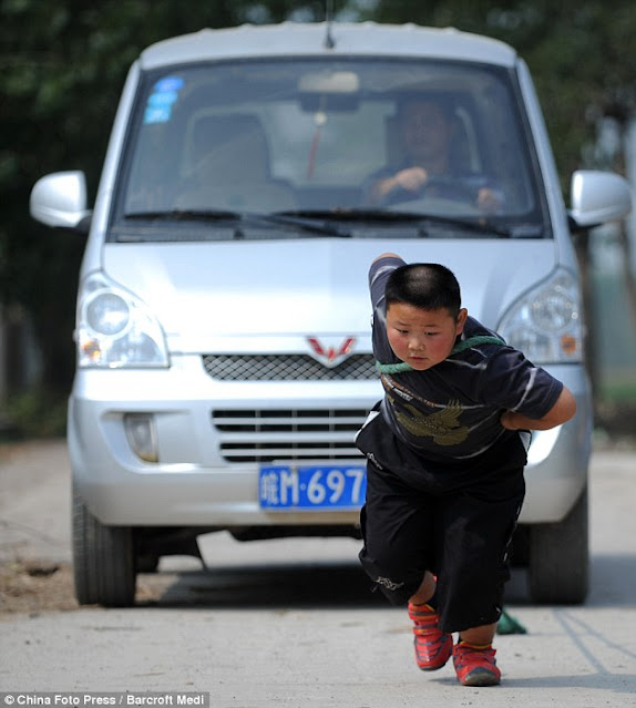 Yung Jinlong is from Anhui province, china. By the age of nine-month, he was capable of lifting an oil drum weighing 11 pounds (5 kg). Yung Jinlong was only seven years old when he was seen by his community to pull a vehicle weighing 1.85 tons (3,700 pounds or 1,678 kg).